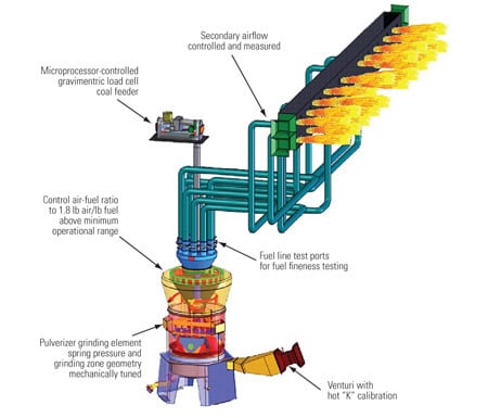 Ontario Power Generation’s huge, eight-unit Nanticoke Generating Station burns both Central Appalachian low-sulfur bituminous coal and Powder River Basin (PRB) coal. Tests conducted at the plant have shown an economic benefit from selectively bunkering the coals and blending them in the furnace, rather than beforehand. Unfortunately, switching coals requires operators to change the pulverizer’s air/fuel ratio and outlet temperature settings.