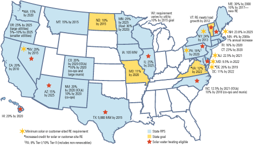 Renewable portfolio standards (RPSs) of various forms have been adopted by 28 states and the District of Columbia (Figure 1). Some set voluntary goals with long implementation schedules; others—like those of Texas, which call for 5,880 MW of renewable power sales by 2015—mandate both an absolute value and a near-term deadline. Several RPSs (like those of Illinois, Minnesota, and Oregon) aggressively target a penetration goal as high as 25% but allow plenty of time to meet it (2025, in all three cases).