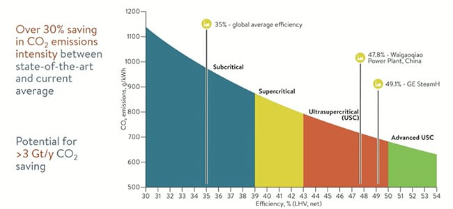 | 1. “The efficiency increases result from increasing the steam temperatures from subcritical process—where the maximum steam temperature would be 540C—to a supercritical system—where we’d be looking at right about 580C maximum—to ultrasupercritical, which is the state-of-the-art at present, where we’d be looking at 620C, maybe towards 640C; and then advanced systems, which are still at the development and demonstration stage, where we are looking at steam temperatures of about 700C or higher in some cases,” explained Dr. Andrew Minchener, general manager of the International Energy Agency’s (IEA’s) Clean Coal Centre. The global average efficiency of coal power plants is about 35%, he noted. Courtesy: IEA Clean Coal Centre, “HELE Coal Power Plants Worldwide,” November 14, 2018 |