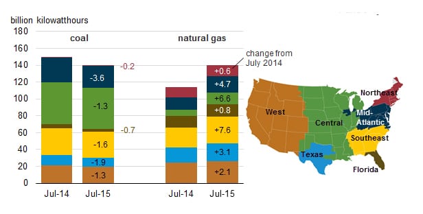 - A fall in the price of gas has led to a big shift in the utilization of the nation’s coal and gas plants, with gas-fired combined cycle power plants seeing capacity factors above those of coal plants in 2015 for the first time ever. Source: Energy Information Administration