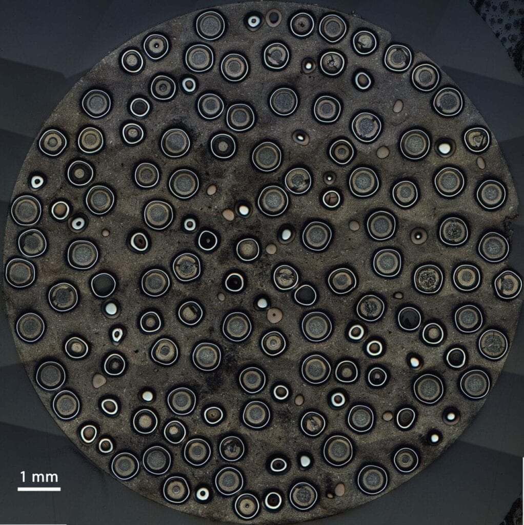A cross-sectional view of an Ultra Safe Nuclear Corp. FCM (Fully Ceramic Microencapsulated) fuel pellet. The fuel uniquely encapsulates tristructural-isotropic (TRISO) particles within a dense ceramic matrix, which provides an extremely strong structural support and protects them during power production, postulated accidents, and into long-term storage. Courtesy: USNC