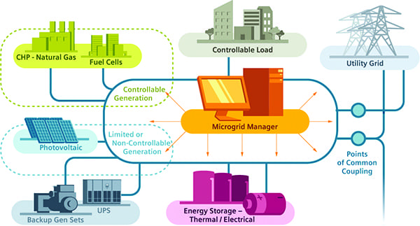 Though diesel gensets have the longest track record for generation in microgrids, gas turbines (especially on educational and commercial campuses) are also common, especially in combined heat and power configuration. More recently, Asmus pointed out, the trend is to add solar photovoltaics to diesel installations to lower fuel costs (while ensuring power availability when the sun doesn’t shine).