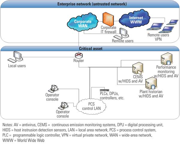 Figure 2 is an example of a typical plant network architecture. At the top is the corporate IT infrastructure consisting of business systems, personal computers, and laptops. Next is the plant demilitarized zone (DMZ) in which firewalls protect the plant and yet allow corporate access to certain types of plant data such as the plant historian. Deeper into the network are the plant distributed control systems (DCS) for turbine control, balance of plant, water plant, continuous emissions monitoring, and historian. At the lowest level are the controllers themselves, such as the programmable logic controllers (PLCs) for each of the turbines.