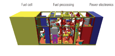 5. Molten option. One design option under active development is the 50%-efficient molten carbonate ship service fuel cell. FuelCell Energy is supplying the complete package in a cost-sharing contract with the Office of Naval Research. The fuel processor module is designed as a stand-alone unit. The overall size is 26.5 by 8.3 by 11 feet.