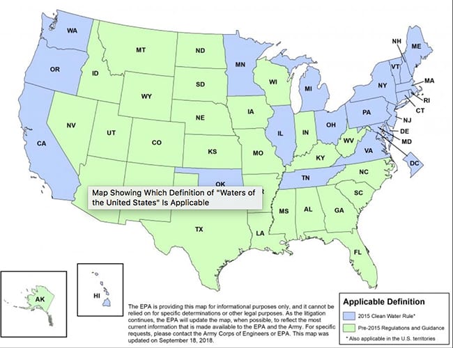 In their complaint, the states say the rule’s new definition of “Waters of the United States” (or WOTUS) violates provisions of the Clean Water Act, the National Environmental Policy Act, and the U.S. Constitution. The states want the rule vacated and the EPA and Corps enjoined from enforcing a new definition of “Waters of the United States.”